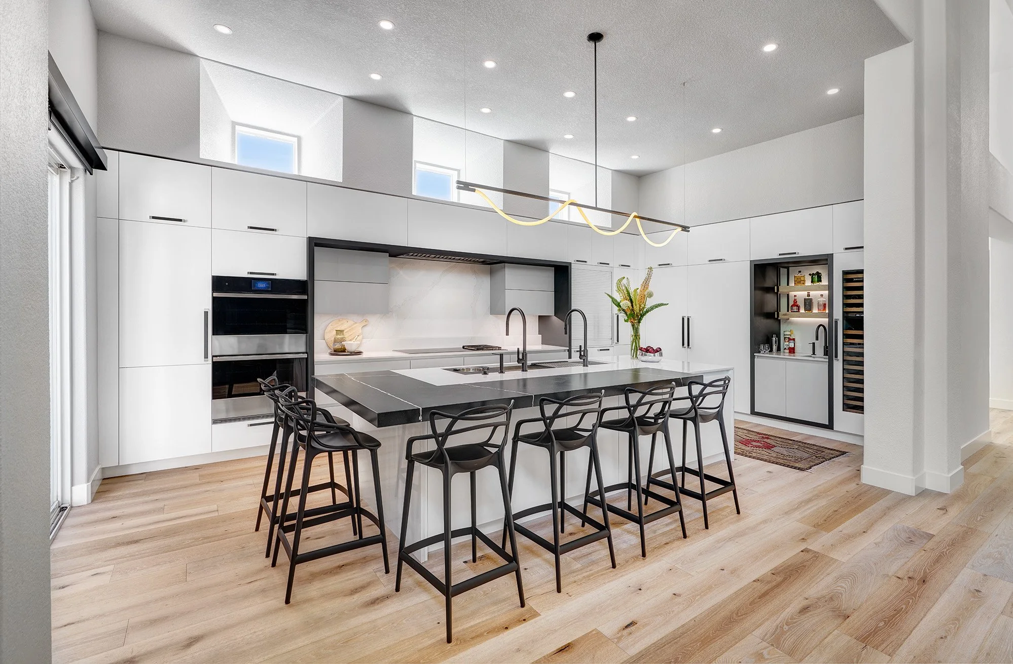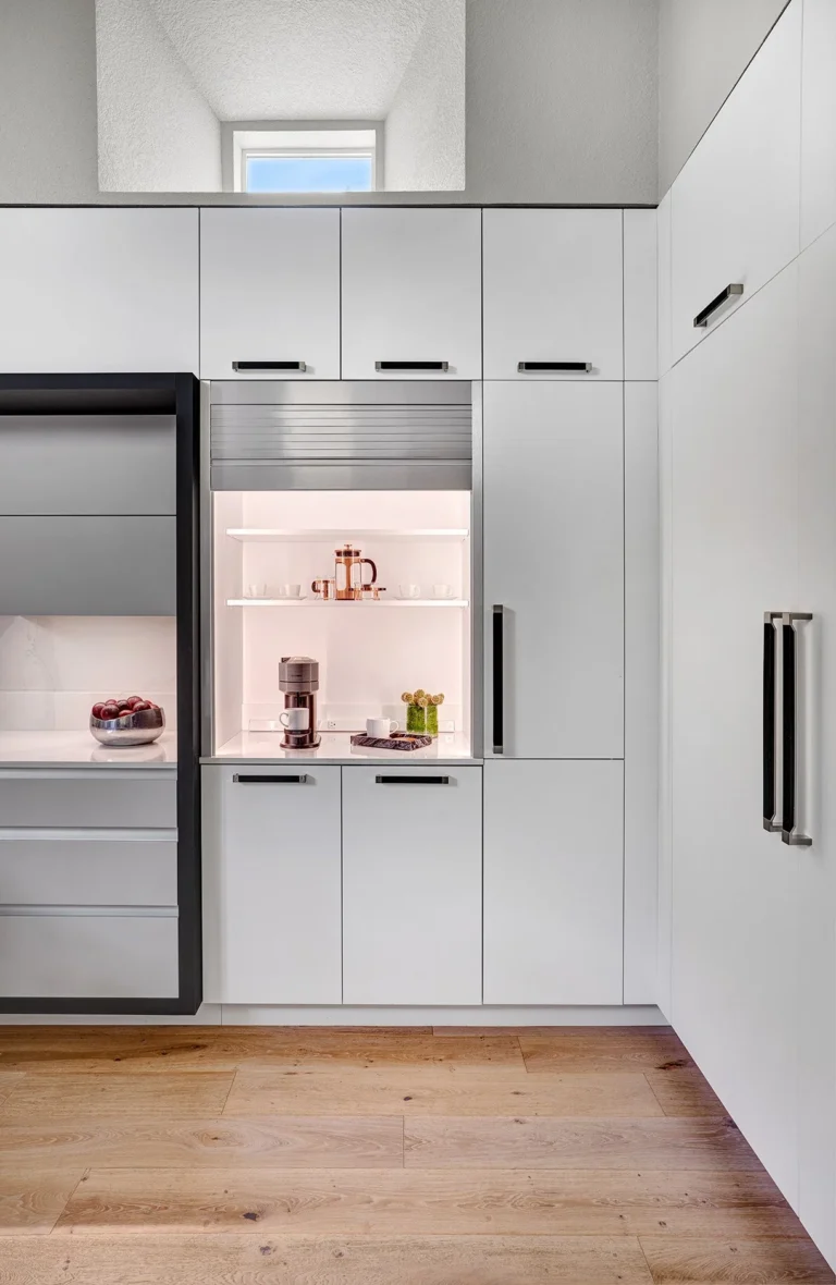 - Full-height custom cabinetry with minimalist pulls and hidden appliance garages