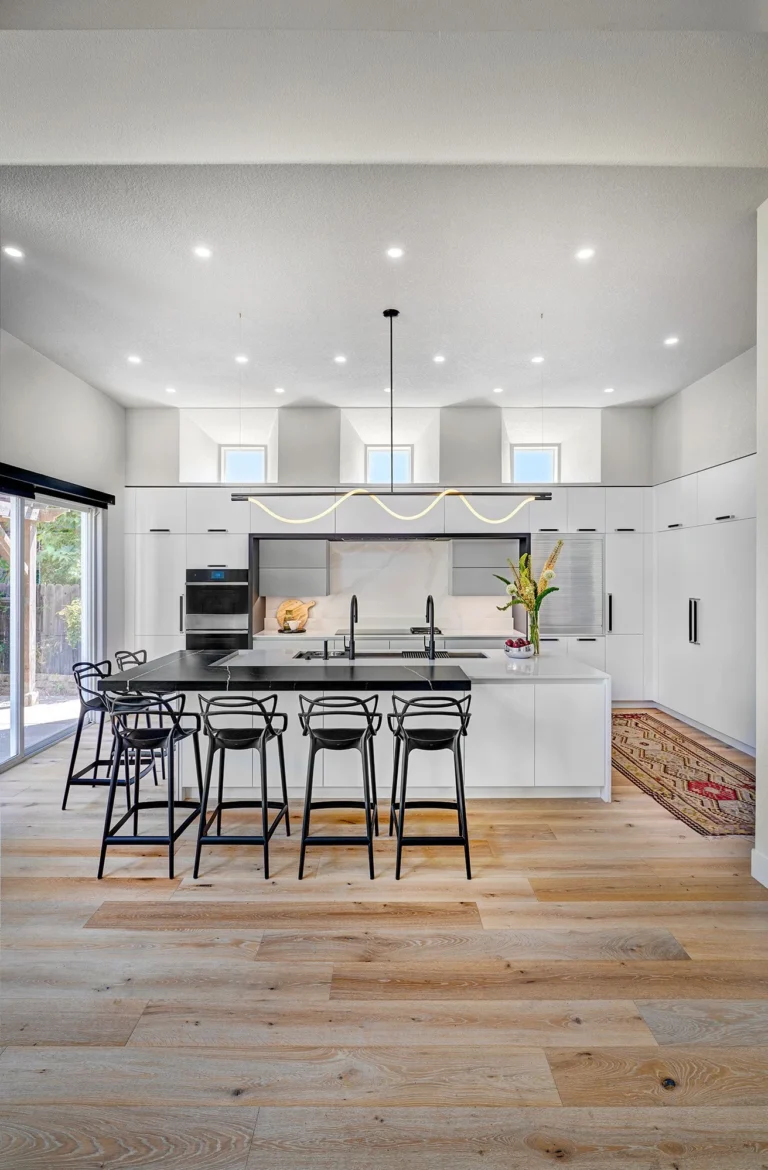 Sleek, functional, and timeless. This complete kitchen remodel by Tenax Construction Inc. showcases a modern Blanc + Noir concept with a dramatic black waterfall island, matte white slab cabinetry, and integrated appliances. Design and cabinetry by Nar Design Group. Photography by Freddie Donham.