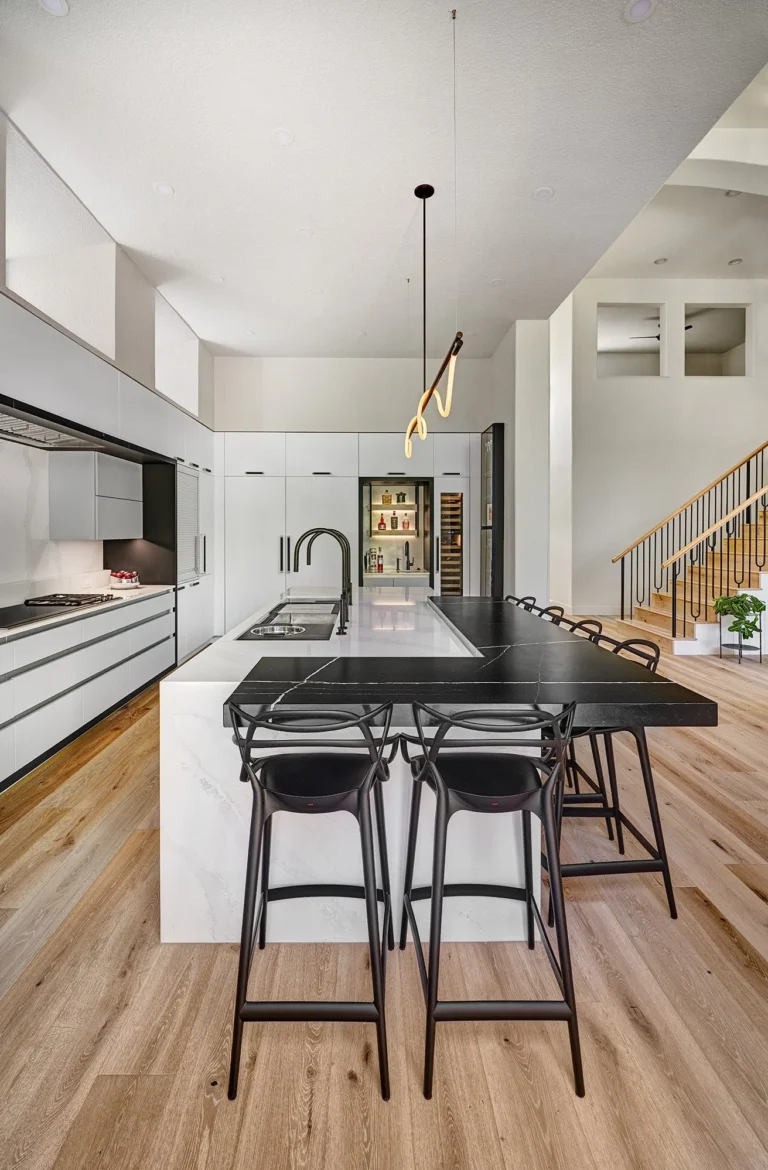 - Expansive U‑shaped island with contrasting white quartz waterfall and black stone prep surface, dual sinks, and seating for six