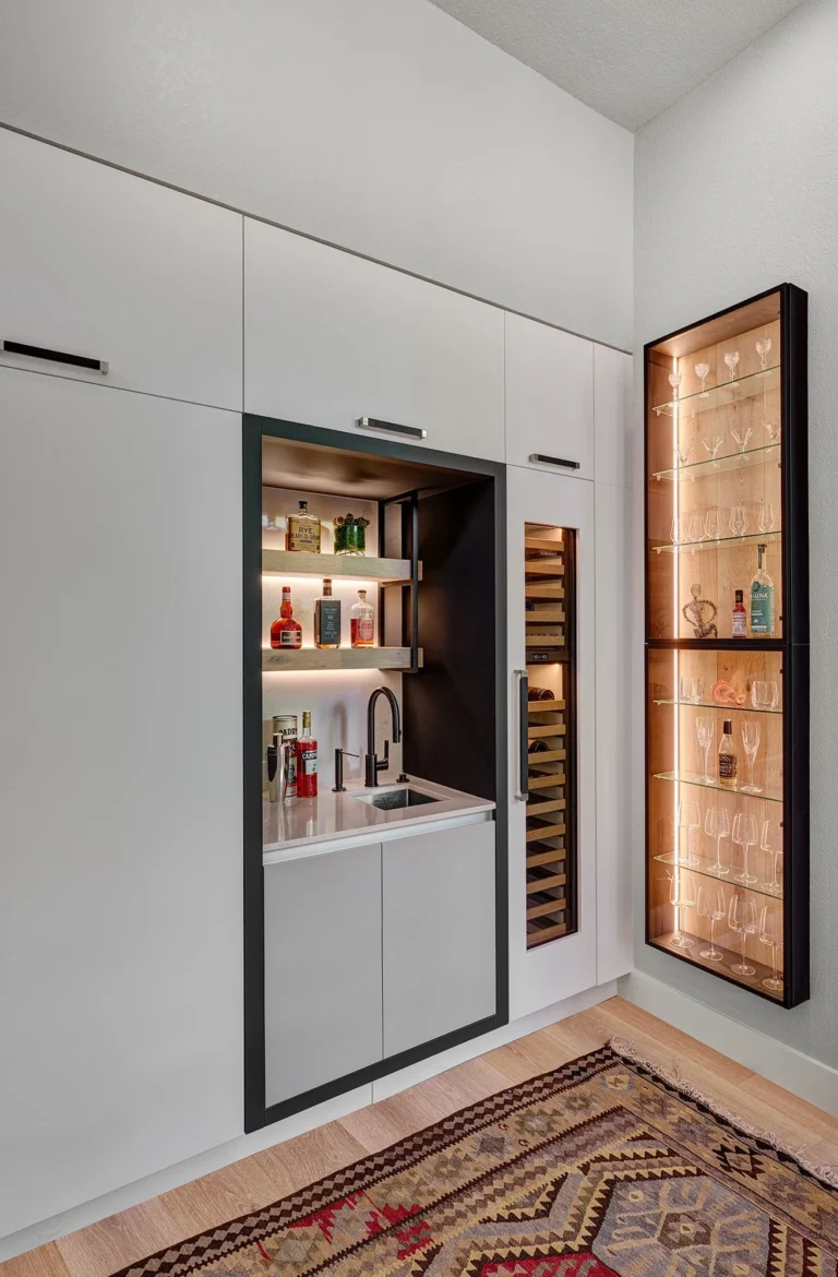 - Built‑in wet bar with wine column, illuminated glass display, and undercounter sink