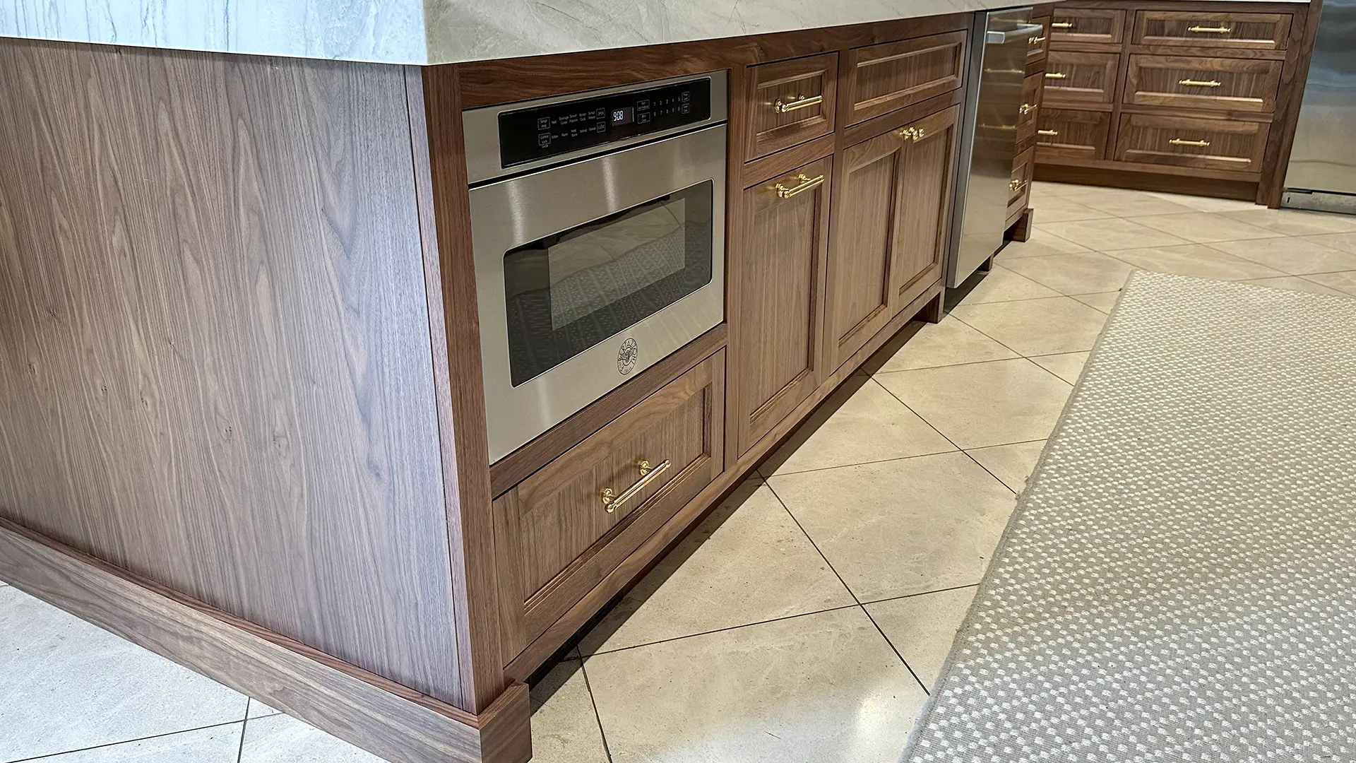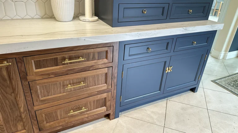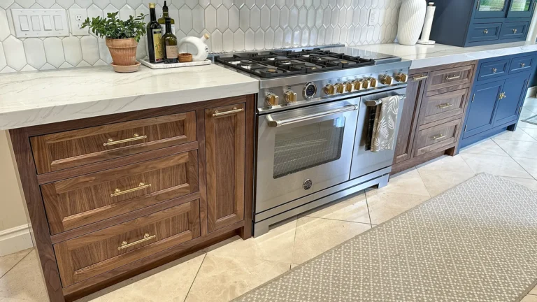 All existing cabinetry was carefully removed and replaced with fully custom, inset‑door cabinets designed, drafted, and approved prior to demolition. Walnut inset door cabinets highlight both the island and hutch areas, adding depth and rich contrast to the light, open layout. - Island & Hutch Features: