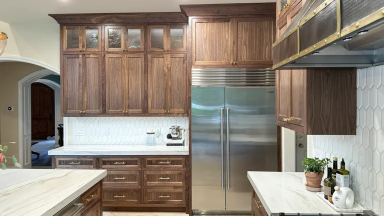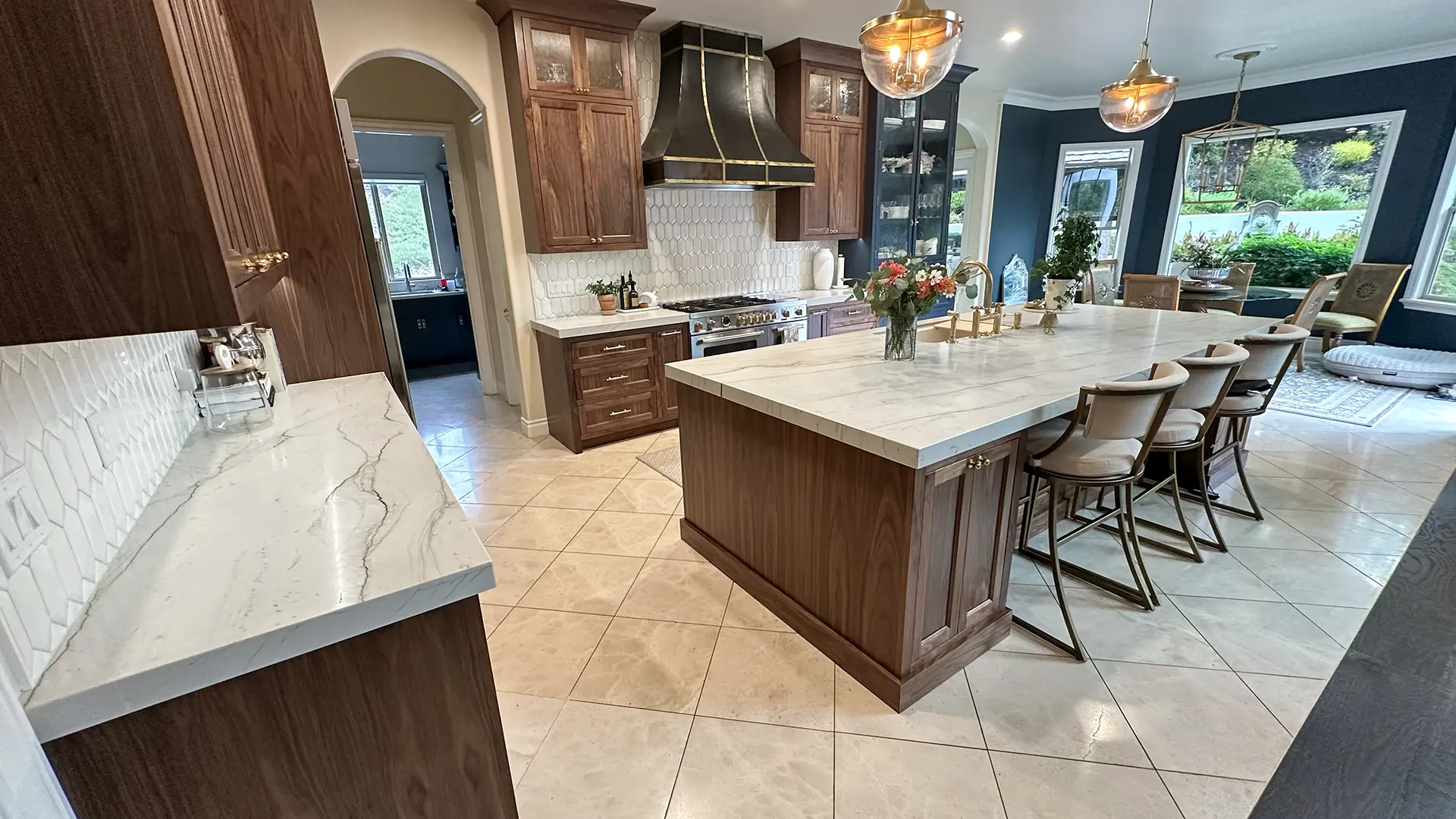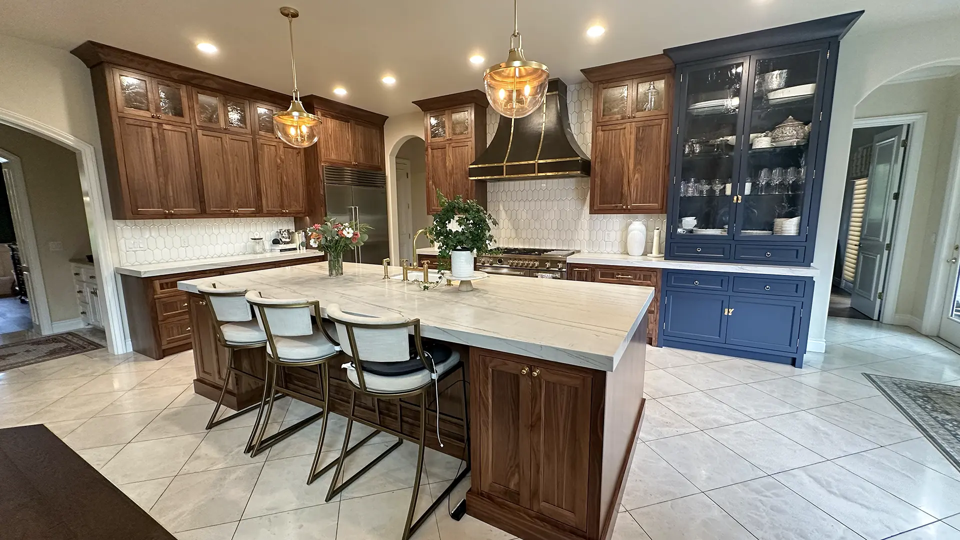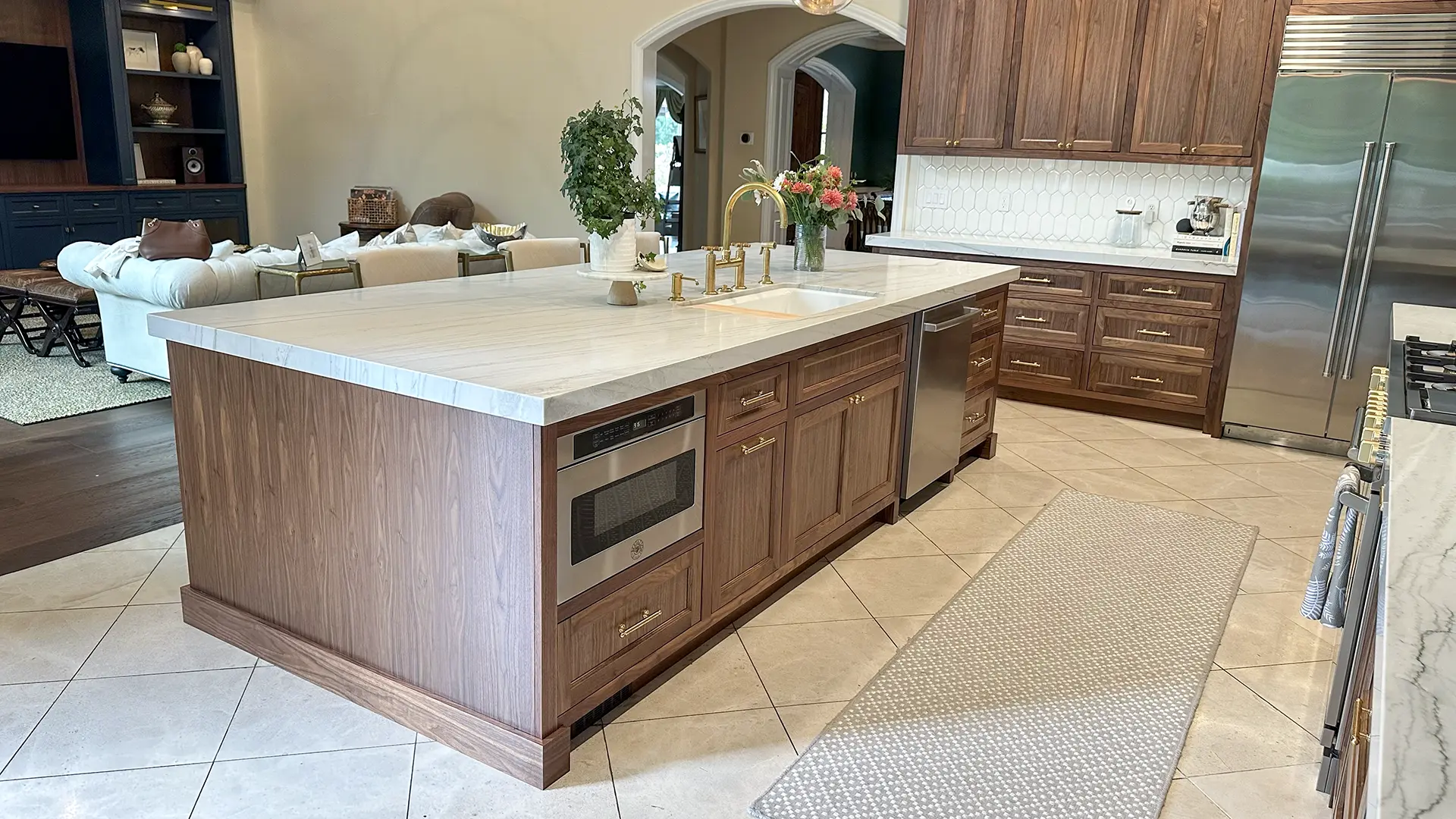 Scope: Full kitchen and great room remodel with custom cabinetry, quartz finishes, walnut accents, and detailed millwork.