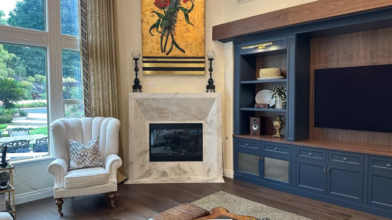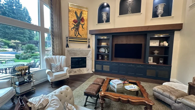 The result is a seamless kitchen renovation that feels both custom and inviting. Clean lines, walnut accents, glass cabinetry, and natural stone textures give this Granite Bay home a refined yet approachable aesthetic. Every detail — from cabinet joinery to the fireplace mantle — was handled with care and precision.