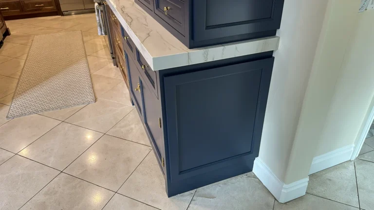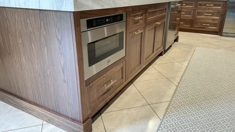The squared‑off kitchen island was expanded with a new 12” set of cabinets on the back, offering hidden storage behind clean inset doors while preserving a comfortable 12” overhang for bar seating. The island now includes a built‑in microwave drawer and a garbage pull‑out for modern convenience. - Perimeter Cabinets: