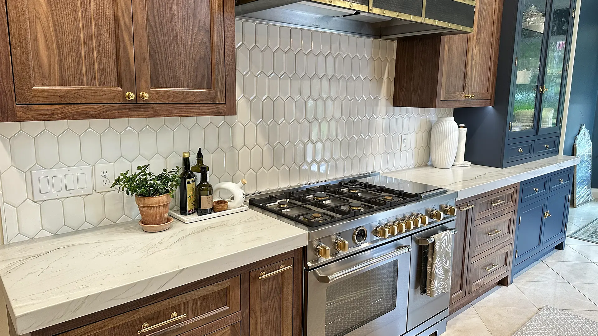 Painted inset‑door cabinets extend all the way to the ceiling, topped with a consistent row of glass‑front display cabinets and crown molding that seamlessly ties into the existing trimwork. Deepened range wall cabinets frame the cooktop while discreet pull‑outs on either side keep essentials organized and accessible. - Countertops & Backsplash: