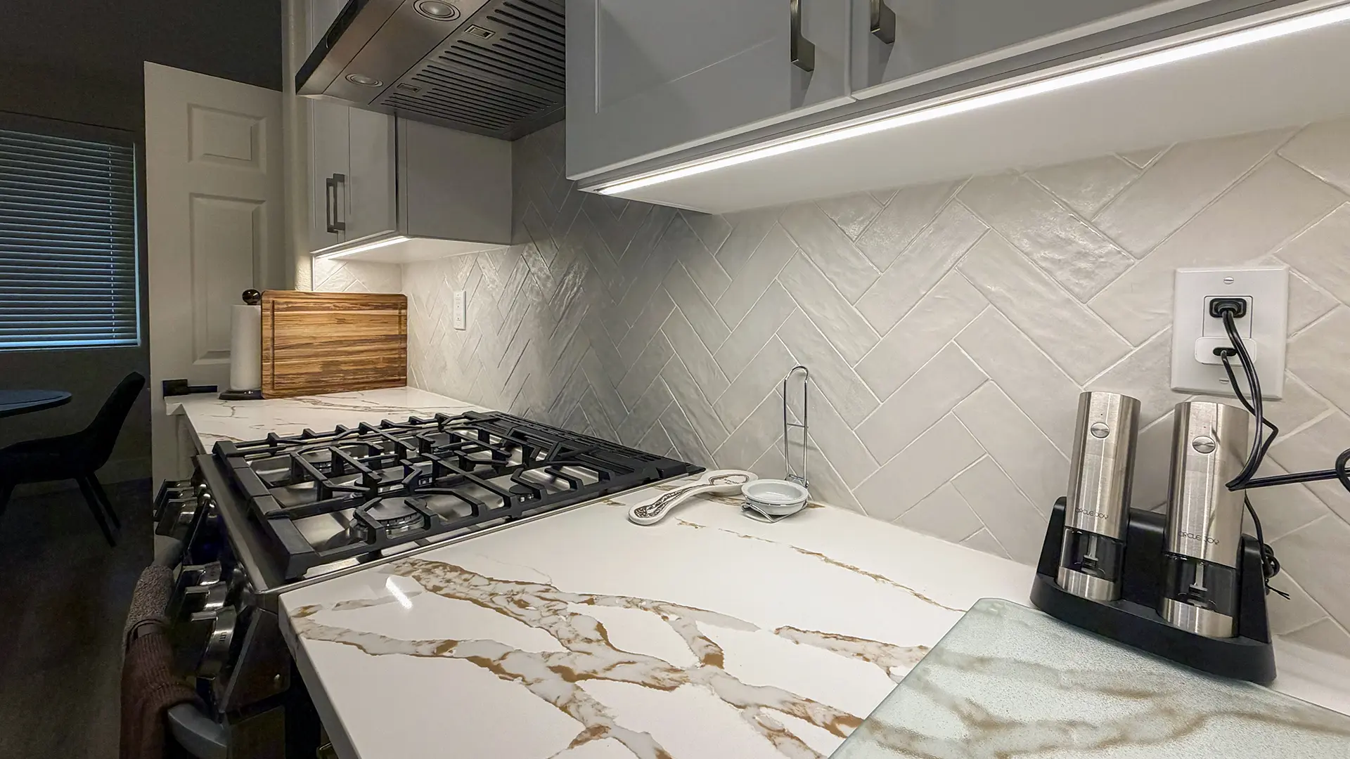 - Removed standard wall outlets and installed under-cabinet power strips (2 total) for a cleaner backsplash look