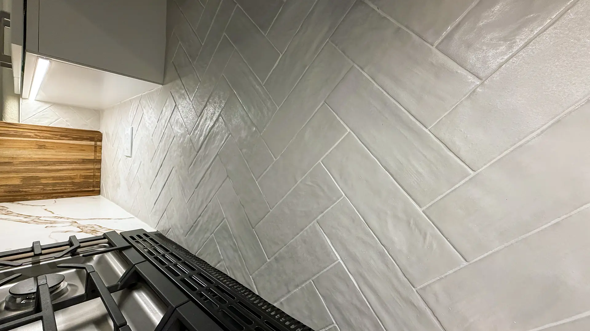 - Installed a full-height white tile backsplash all the way to the ceiling